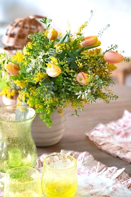 明るい黄色のミモザに、やさしいピンクのチューリップを合わせ、斜めのラインを生かして束ねる軽やかなブーケを作ります。