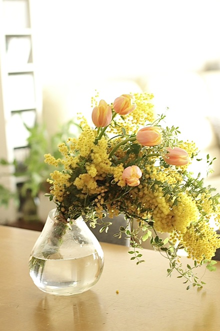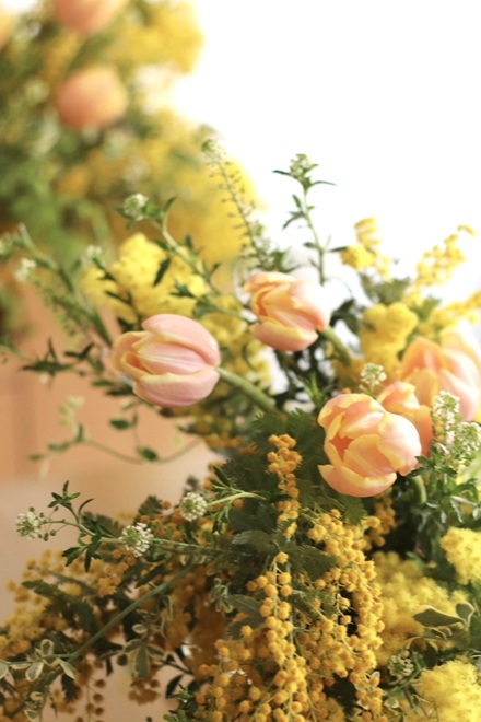 ふわりと広がるミモザに、やさしい色合いのチューリップを重ねると、写真のように明るい光をまとったブーケに仕上がります。