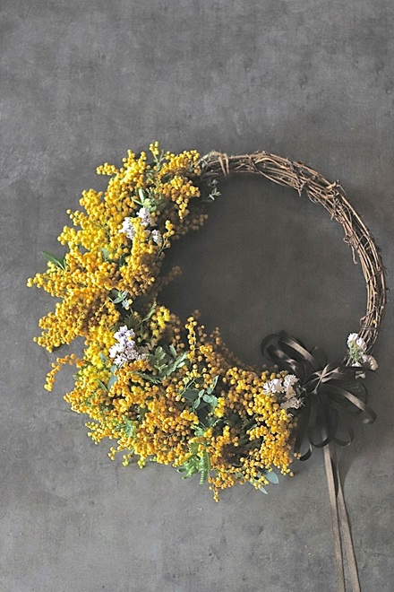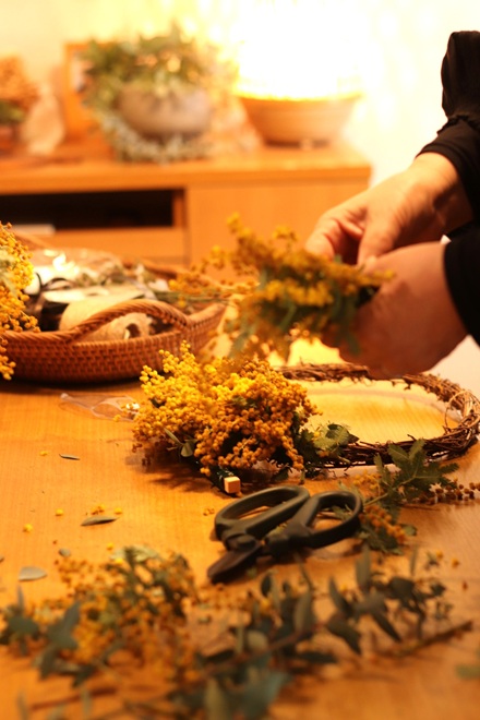 2月の単発レッスンでは、ミモザのリースをゆったりと楽しんでいただきました。